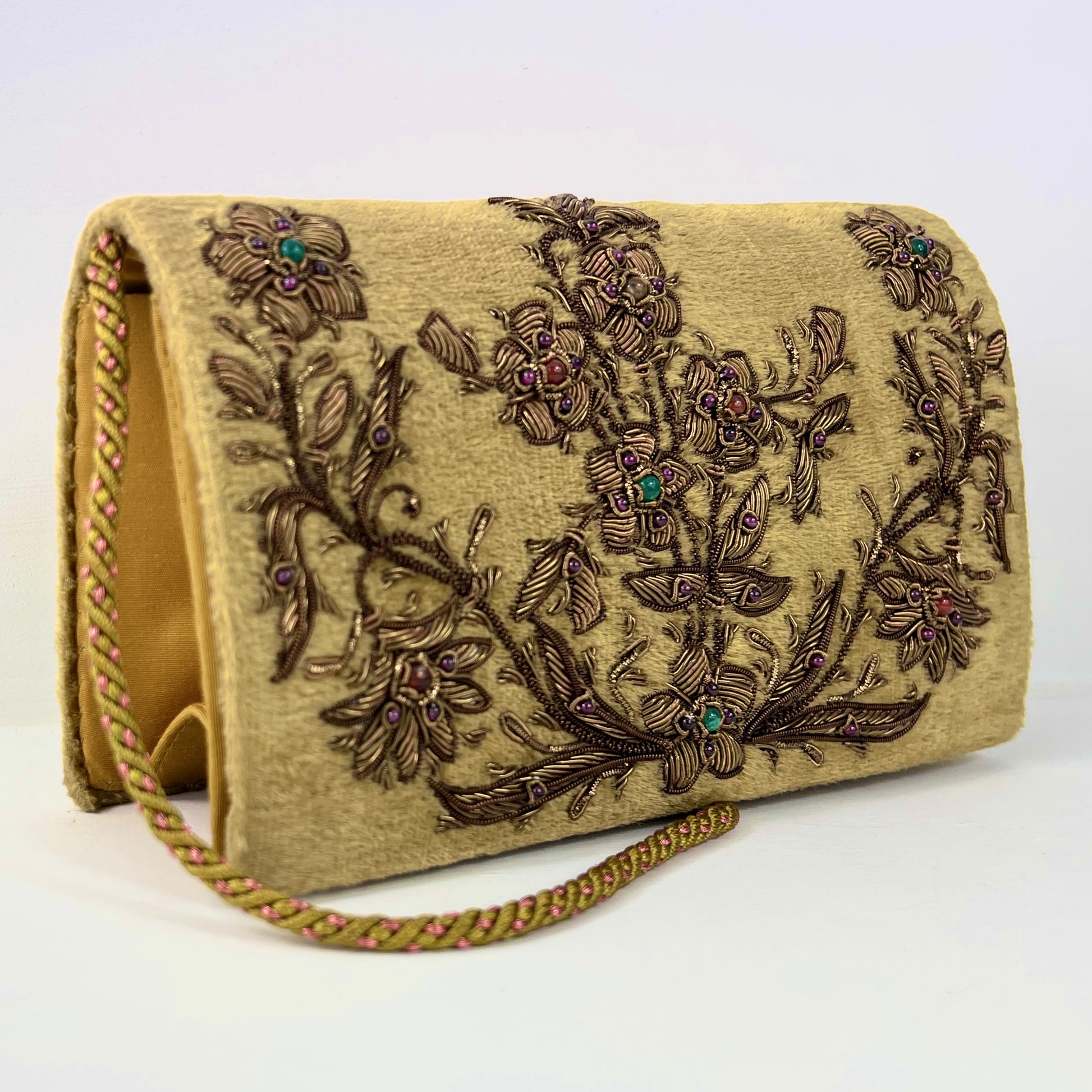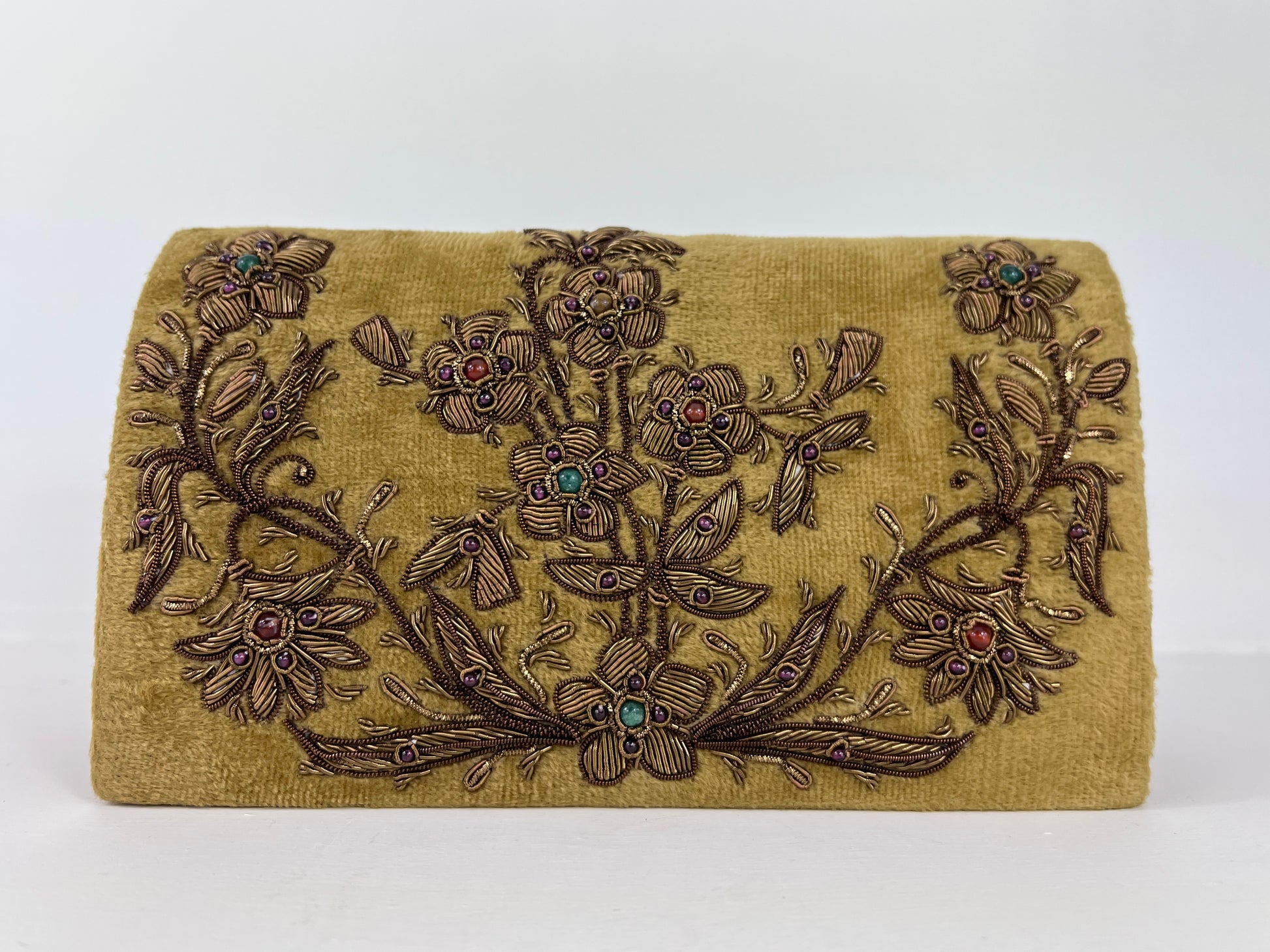 We do have an undying love for anything velvet, but when it's embroidered, we simply adore it. This little velvet bag has gemstones and gold threads hand embroidered in the front. It's lavish, extraordinary and SO beautiful! The soft velvet is in a shade of gold, almost chartreuse.