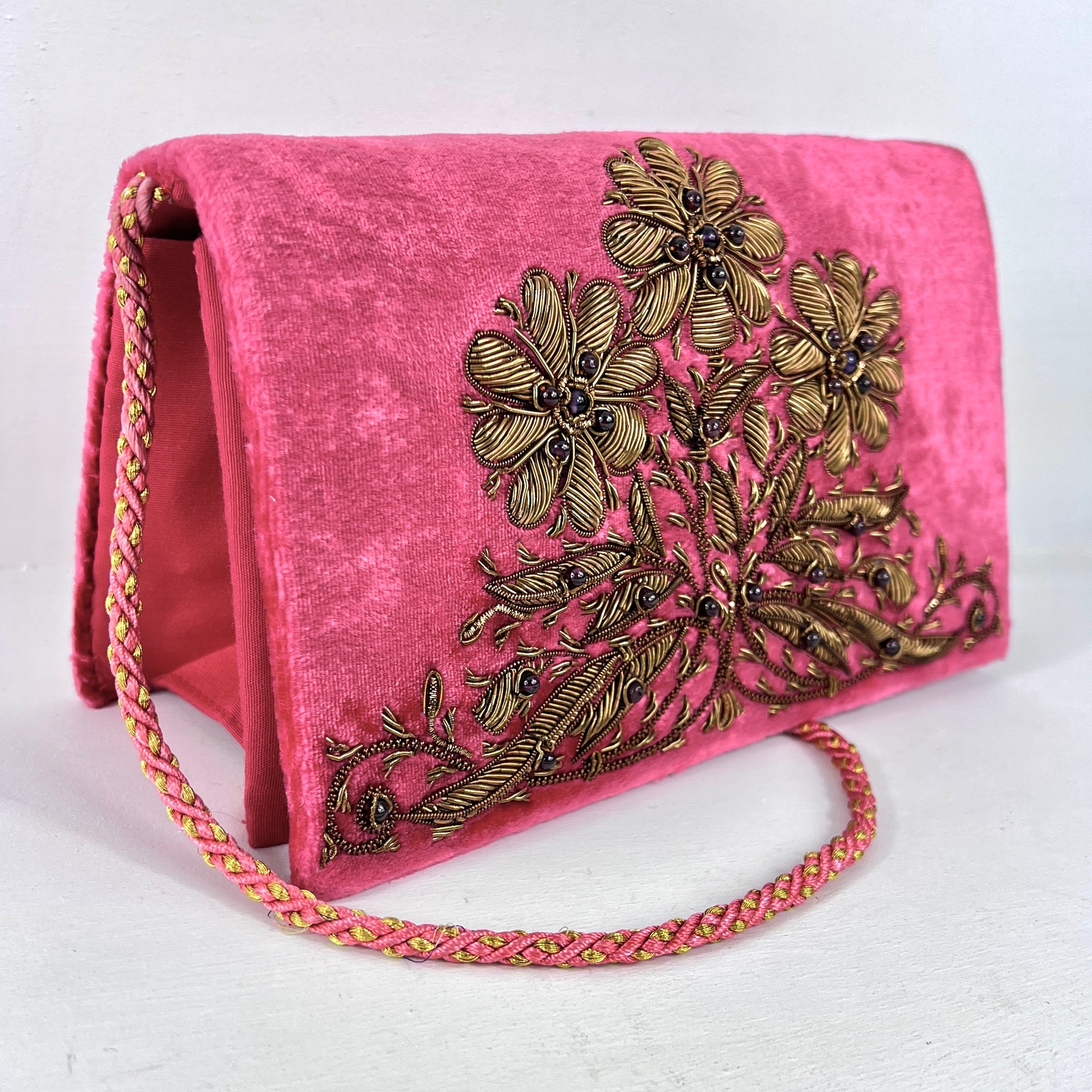 We do have an undying love for anything velvet, but when it's embroidered, we simply adore it. This little velvet bag has gemstones and gold threads hand embroidered in the front. It's lavish, extraordinary and SO beautiful! The soft velvet is in a shade of deep pink we love, you'll want a matching lipstick!